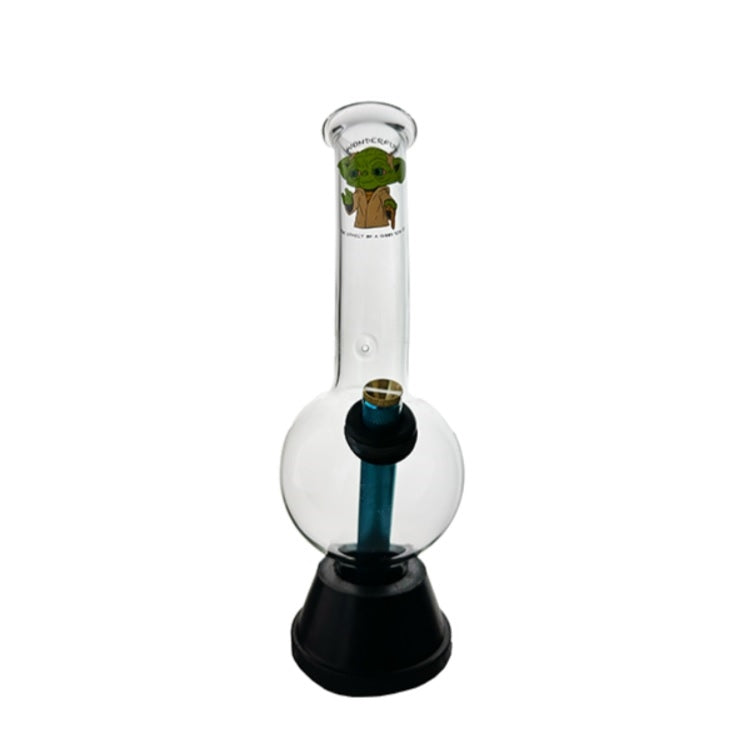 This 25cm premium glass bong features a whimsical sticker of a relaxed Yoda-inspired character, paired with the phrase, “Wonderful, the effect of a good sesh is!” .